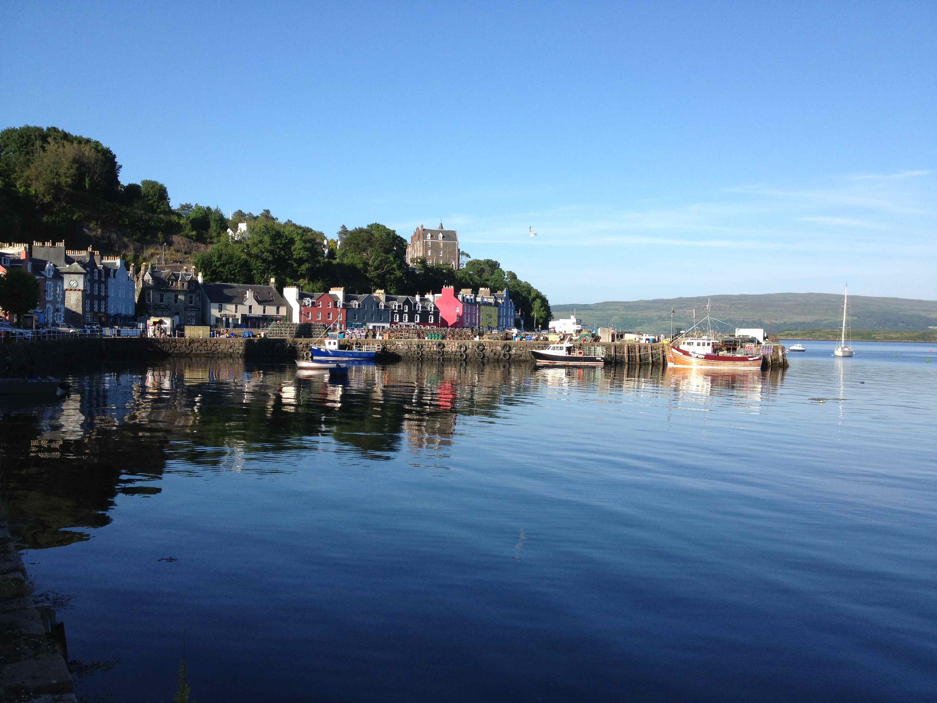 Après deux traversées en ferry (Armadale-Mallaig pour quitter Skye puis Kilchoan-Mull) et de la petite route (beaucoup de petite route!) nous voici à Tobermorry, un splendide petit port aux maisons toutes colorées, aur l’île de Mull.