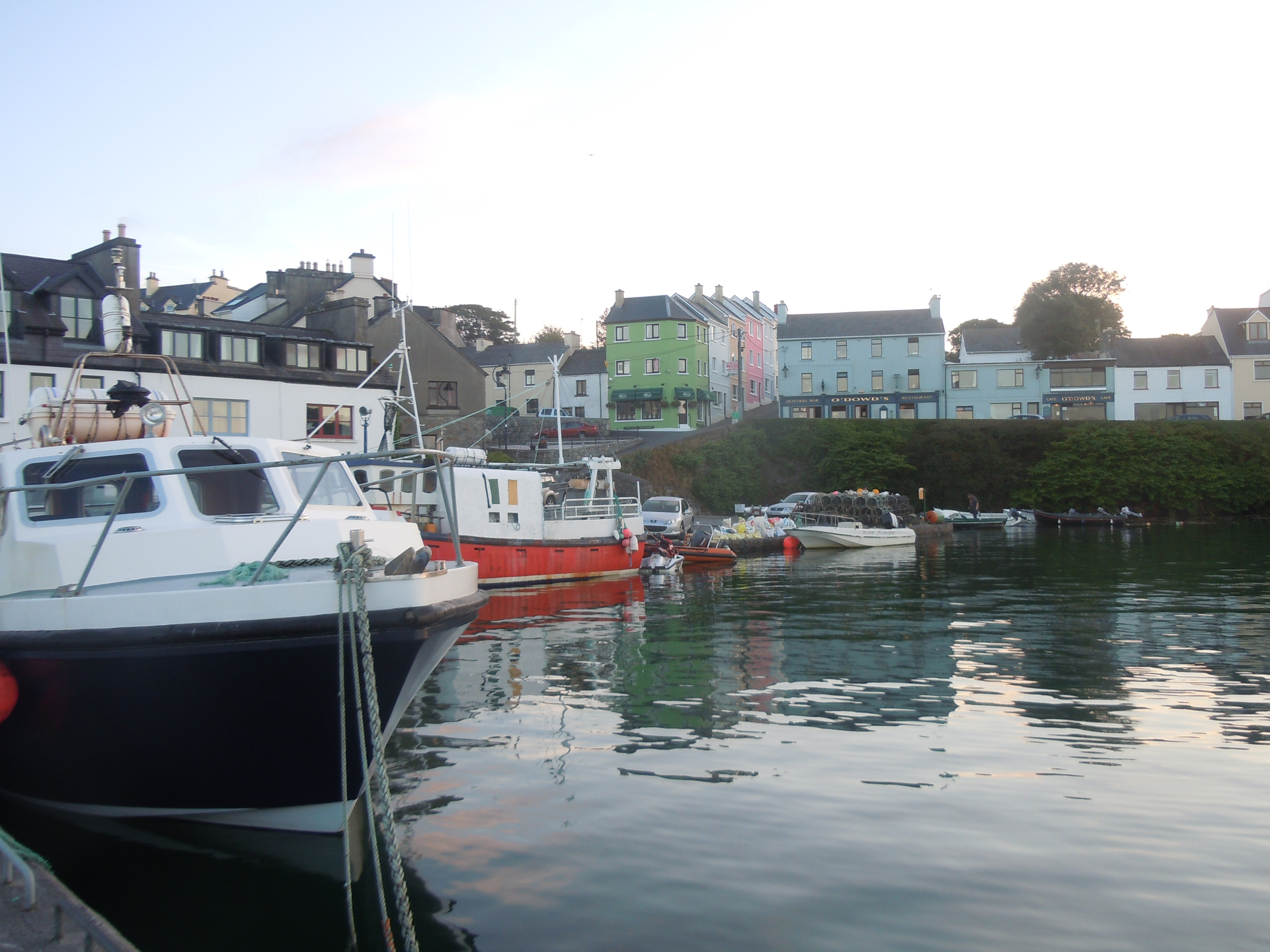 Qu’il fasse beau ou mauvais temps, nous allons souvent chez O’Dowd’s, notre bienfaiteur à Roundstone. C’est le pub le plus proche de notre maison: le bâtiment bleu sur la photo: