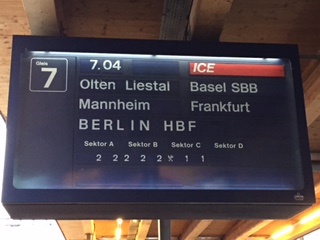 Ce matin, lever à 4h25, et 1er train en gare de Lausanne à 5h45, direction Berne. A Berne, l’ICE pour Berlin nous attend sur le même quai, pour un trajet agréable, qui devait nous faire arriver à 15h20 à Berlin…