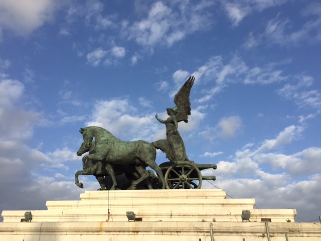 Il faut d’abord escalader une bonne centaine de marches, car c’est de là-haut seulement qu’il part, l’ascenseur! Mais bon, il faut bien le dire, ça en vaut la peine… Il y avait juste un peu de soleil, pour éclairer le forum, le Colisée, la coupole de St-Pierre…