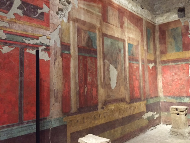 Depuis le Vatican, je décide d’aller au Palatin à pied. J’ai réservé une visite à 12h45 et j’ai le temps. Je traverse donc tout le centre de Rome en marchant. C’est assez long, mais c’est beau! Arrivé sur place, une guide vient me demander si je suis là pour la visite des maisons d’Auguste et Livie, je réponds oui, et elle me dit, alors en route, vous êtes le seul! J’ai donc droit à une visite particulière des deux maisons, ce qui, au vu du nombre de touristes au mètre carré, est un petit privilège. Bon, d’abord il faut escalder le Palatin, ça tombe bien, j’avais pas encore complétement mal au jambes… Puis ouvrir deux ou trois portes pleines de cadenas et voilà ce que je découvre: