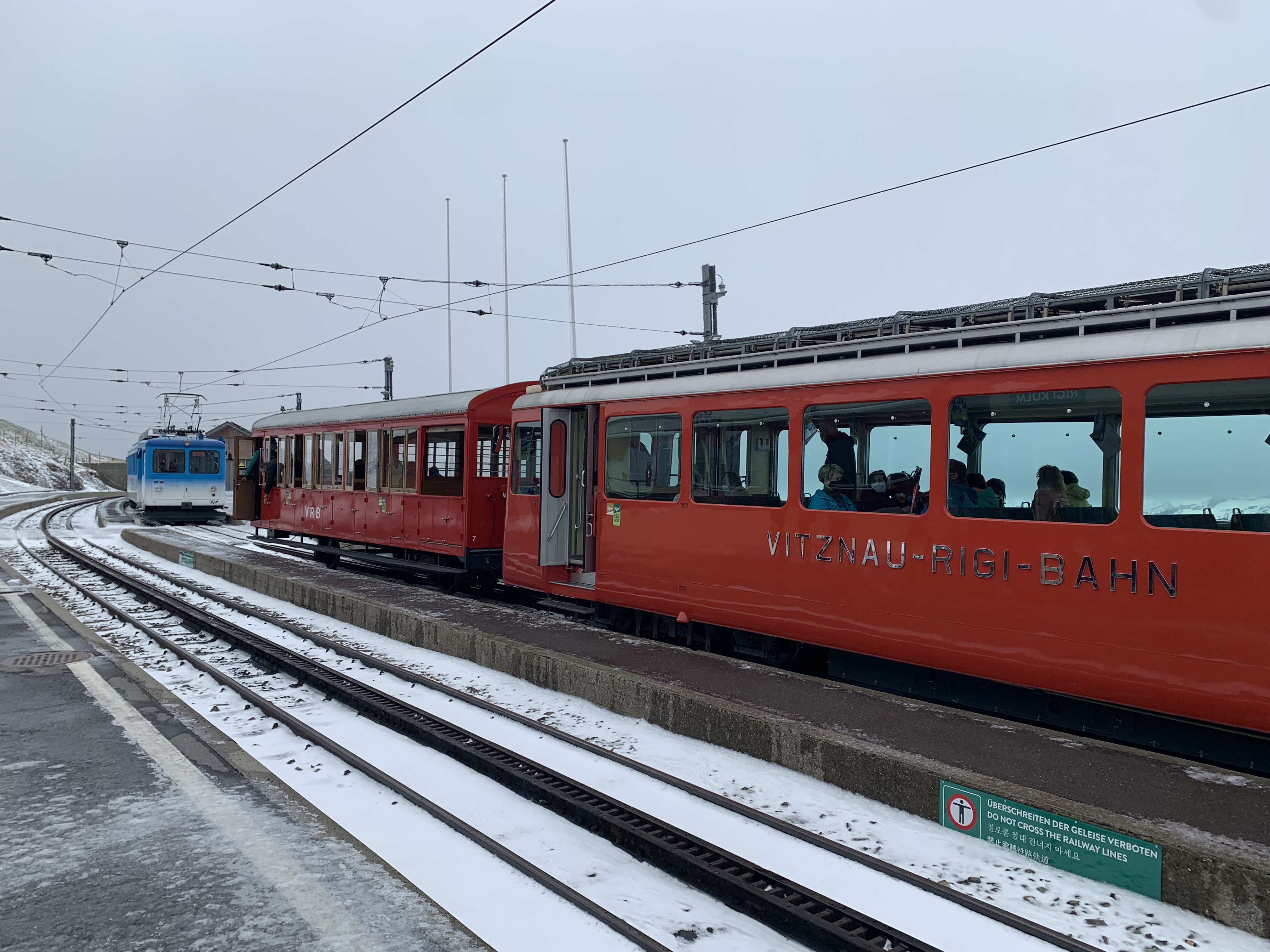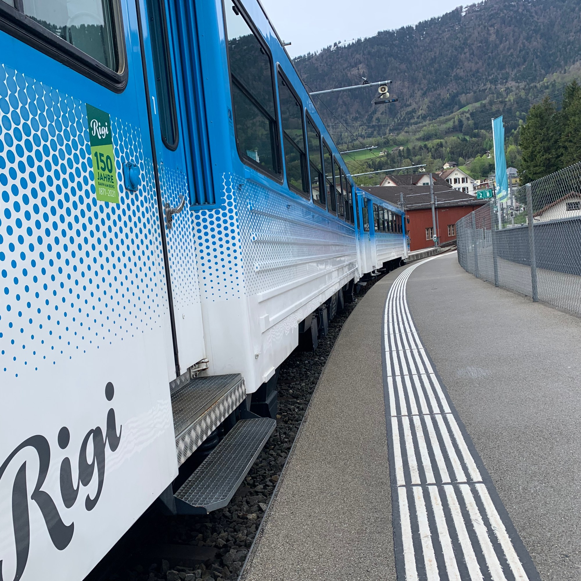 Je monte dans la motrice bleue et blanche des Rigi Bahn, prêt à escalader, aidé par l’aimable crémaillère, ce versant de la montagne.