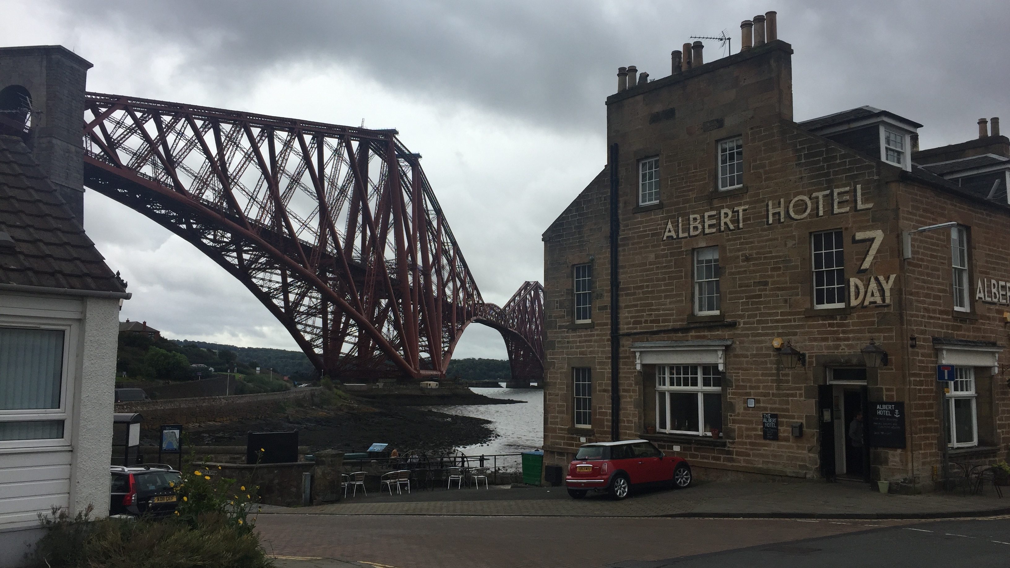 L’autre possibilité, c’est de prendre à Edinburgh Waverley, la gare principale d’Edinburgh, un billet aller et retour pour Norh Queensferry, la petite gare située juste après le pont. De là, quelques centaines de mètres à pied et en pente permettent d’accéder au pied de l’ouvrage, au bord de l’eau. C’est de là que l’on a la vue la plus majestueuse et la plus imposante. C’est ce que je fis par un bel après-midi de 2017, lors d’un séjour ferroviaire et musical sur l’ile britannique.