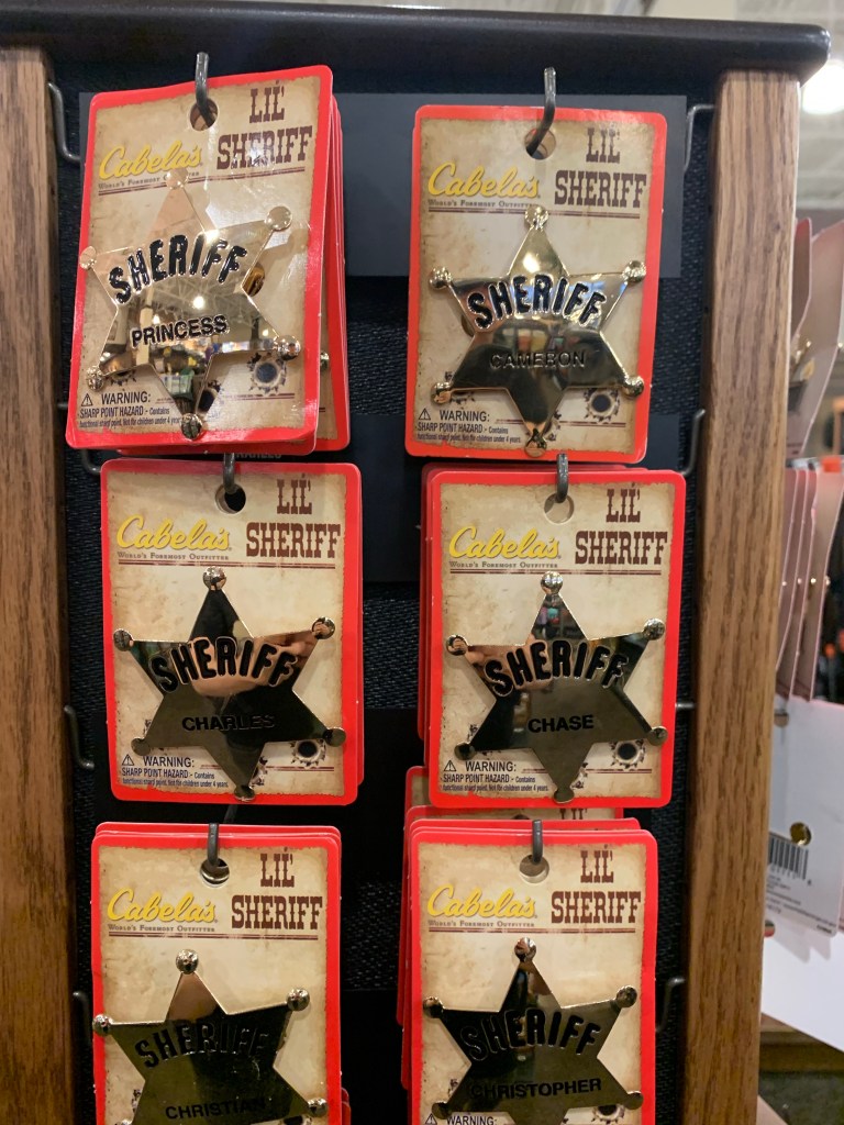 La vue des ces objets en quasi libre accès dans un supermarché spécialisé est tout de même un peu déroutante. Le rayon jouets propose évidemment un large éventail d’armes en plastique. Et aussi des étoiles de shérif.