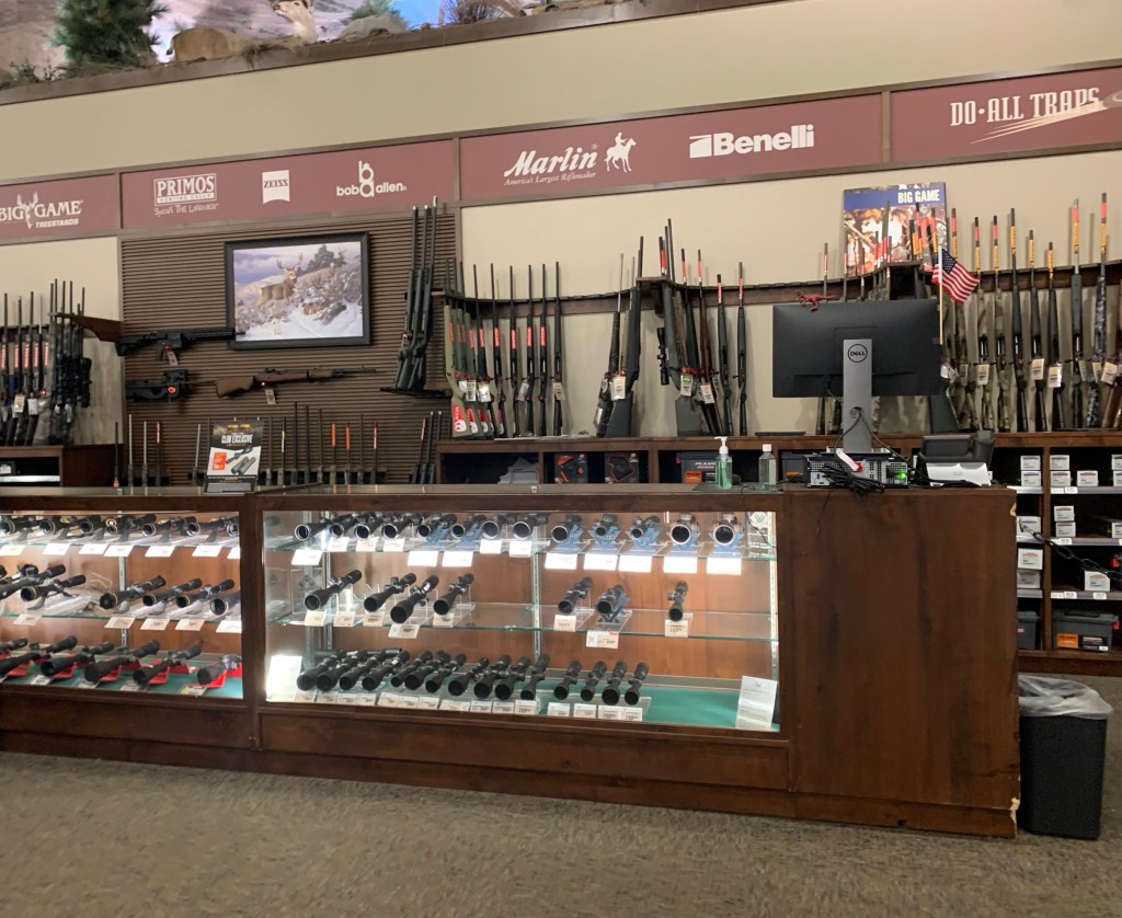 Visite d’un supermarché où l’on trouve tout pour la pêche, et le trekking, mais aussi des armes.