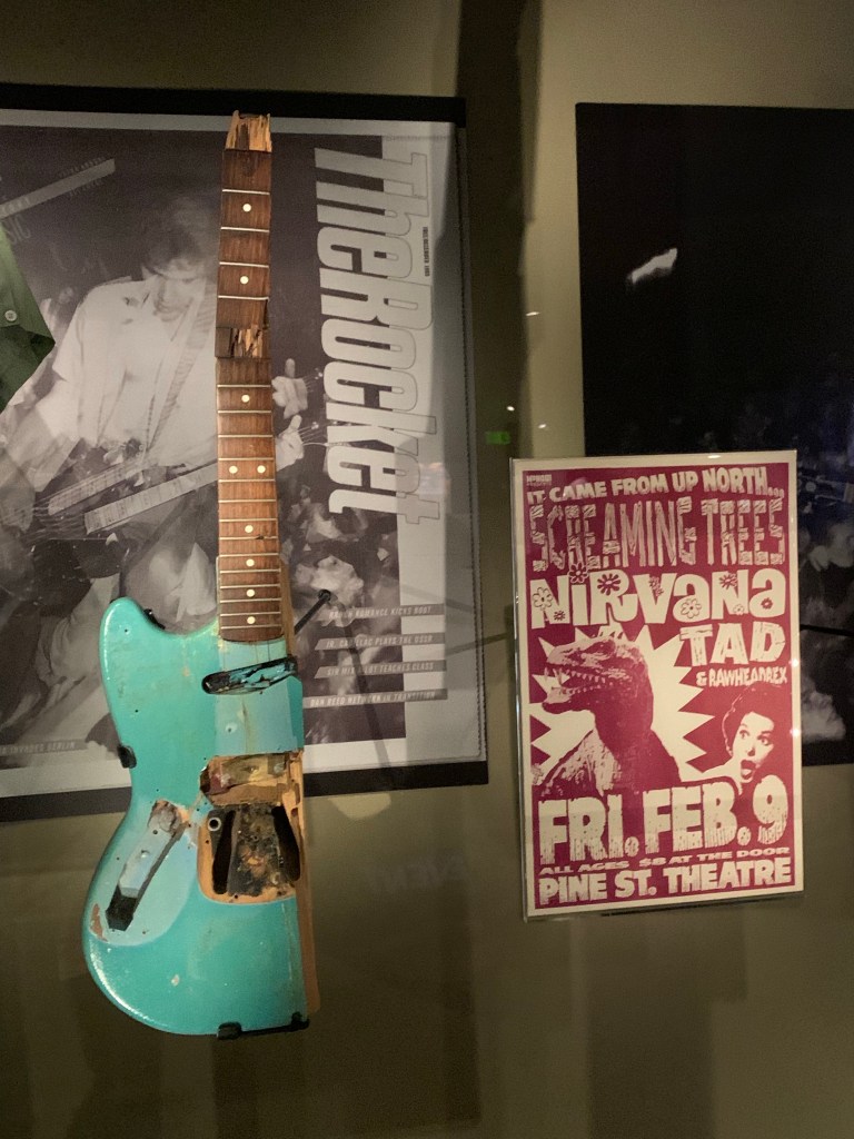 Le bâtiment en lui-même est intéressant, construit par l’architecte Franck Gehry, qui a également dessiné le Musée Guggenheim de Bilbao ou la Fondation Louis Vuitton à Paris. A l’intérieur, plusieurs espaces dédiés aux musiciens nés à Seattle, Jimi Hendrix, Kurt Cobain ou encore Pearl Jam. Mais aussi une expositions d’objets cultes de films américains, de l’aspirateur à fantômes de Ghostbusters à l’épée de Blade Runner. Une colonne d’instruments de musique orne le hall central, tandis qu’un grand espace permet de s’initier aux instruments de musique de la pop : batterie, clavier ou guitares.