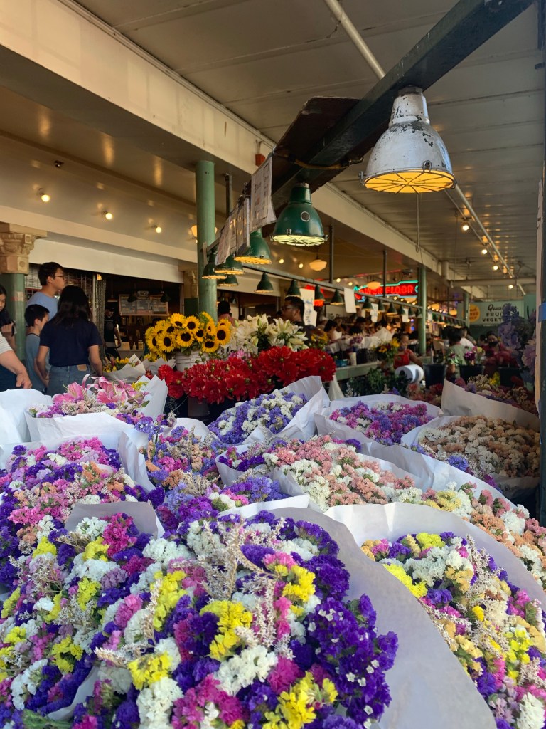 Un formidable et immense marché, qui vend des fleurs, des pinces de crabe géantes, des fromages suisses, des fruits, bref un marché, mais à l’américaine : géant.