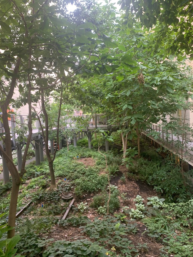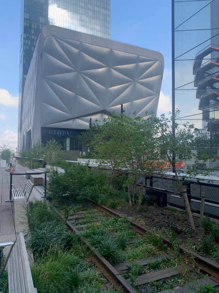 On trouve quelques morceaux de rails anciens sur la High Line, une ligne désaffectée qui servait au transport de marchandises jusqu’au nombreux entrepôts du centre ouest de Manhattan, le long de la rivière Hudson. Mais, comme ailleurs, les entrepôts ont quitté les centres et les voies qu’utilisaient les trains de marchandises pour les approvisionner ont disparu. A la place c’est désormais un chemin piétonnier qui emprunte les anciens ouvrages ferroviaires Quelques bouts de rails sont symboliquement restés en place, savamment entourés par de nombreux arbres et espèces végétales Il fait bon se promener à pied dans ce petit coin de verdure et de fraîcheur au cœur de New York. La promenade peut se faire depuis le Nord pour arriver ensuite à la Whitney Collection remarquable musée consacré à l’art américain.
