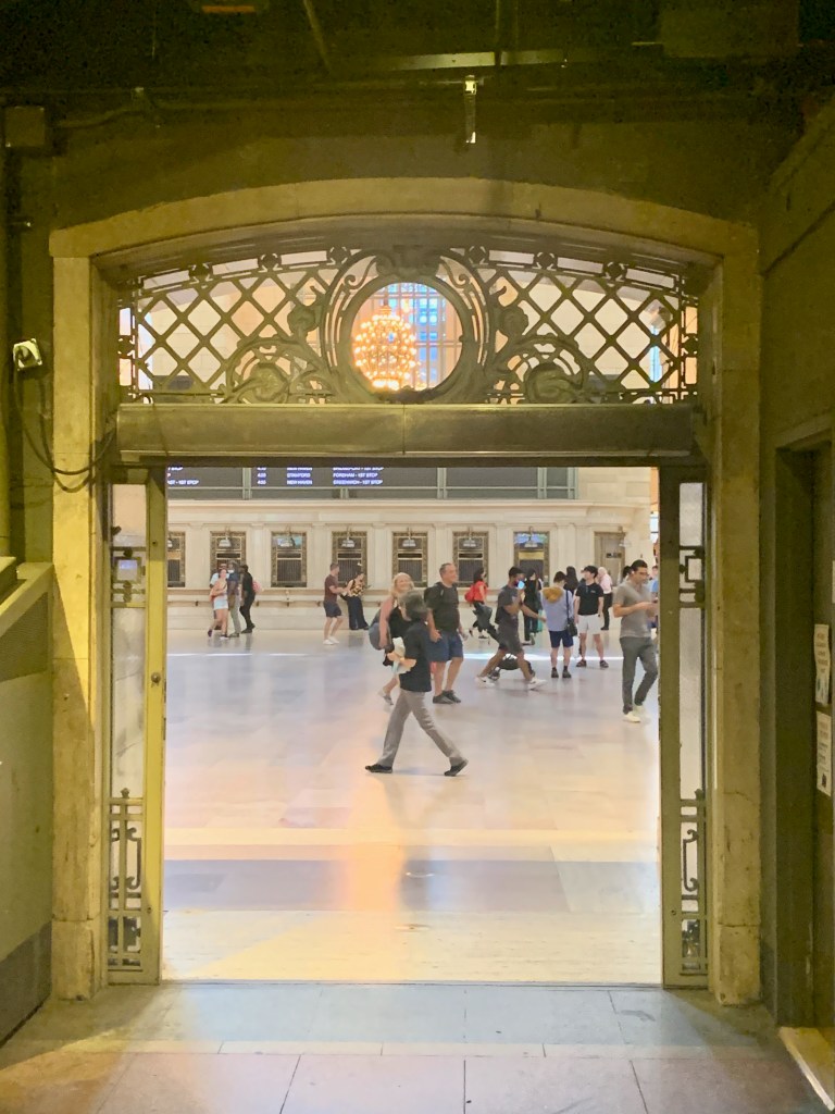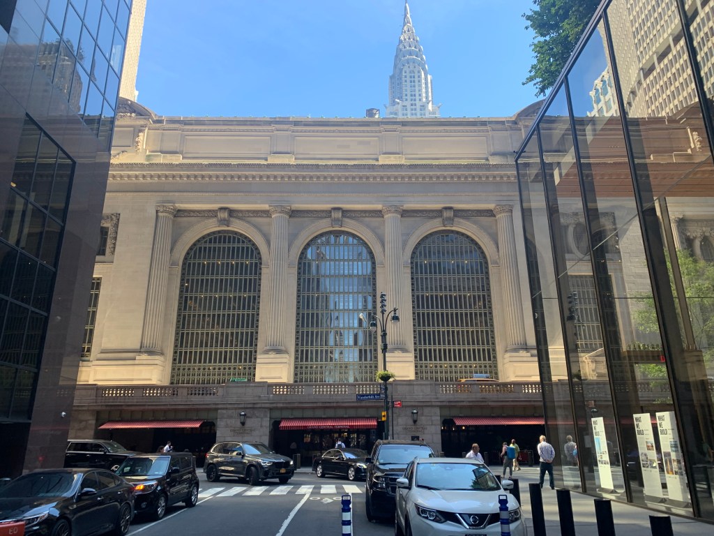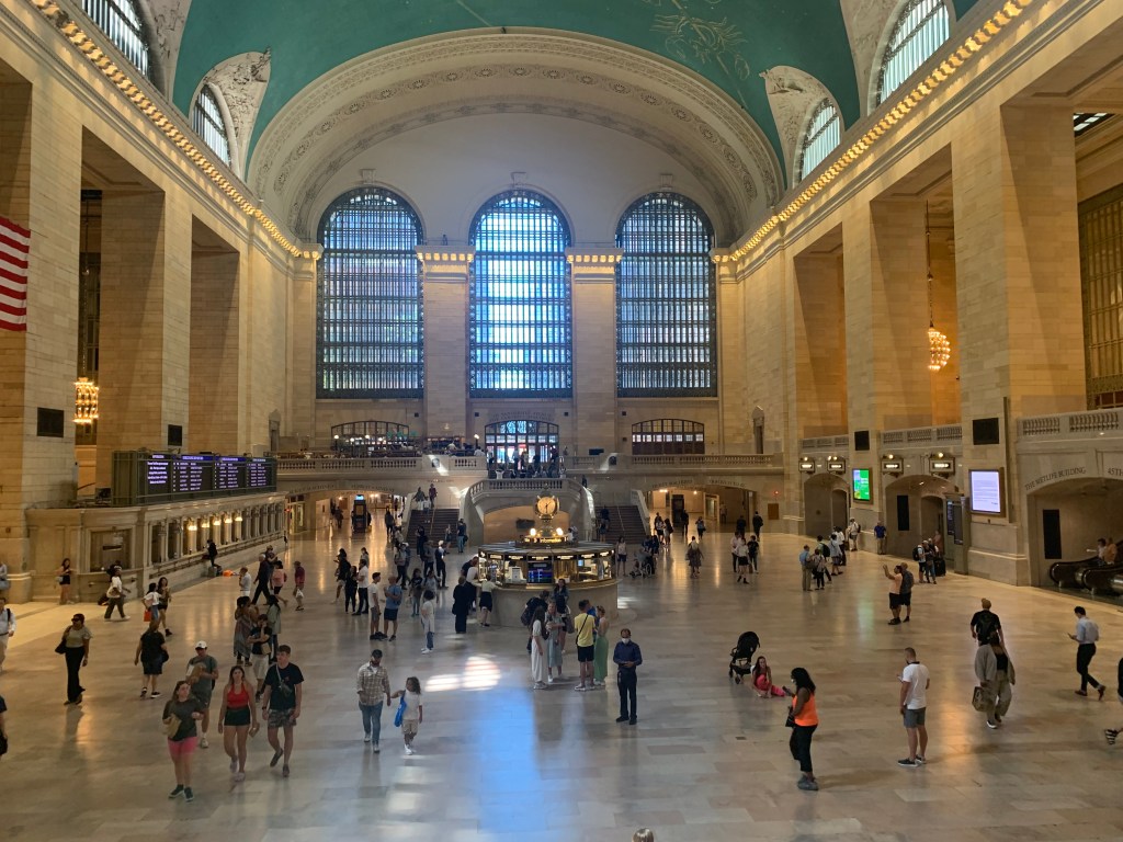 Grand Central, sur la 42e rue, est un imposant bâtiment qui a pourtant de la peine à faire sa place, coincé entre les nombreux gratte-ciels qui l’entourent. Cette gare aux 48 quais a une particularité : en surface, depuis la rue on ne voit pas la moindre trace de train ou de rails. Tout est en sous-sol, dans des souterrains que Mary Higgins Clark a su mettre en scène dans son roman La Nuit du Renard. Comme Union Station à Washington ou comme King Station à Seattle, après avoir passé la porte d’entrée l’on se retrouve dans un gigantesque hall central, occupé en hauteur par un café et par un Apple shop. Les destinationss sur les panneaux des départs nous indiquent que nous sommes dans la gare des trains régionaux. Les trains Grandes Lignes partent et arrivent de l’autre gare de Manhattan : Pennsylvania, sur la 34e rue.