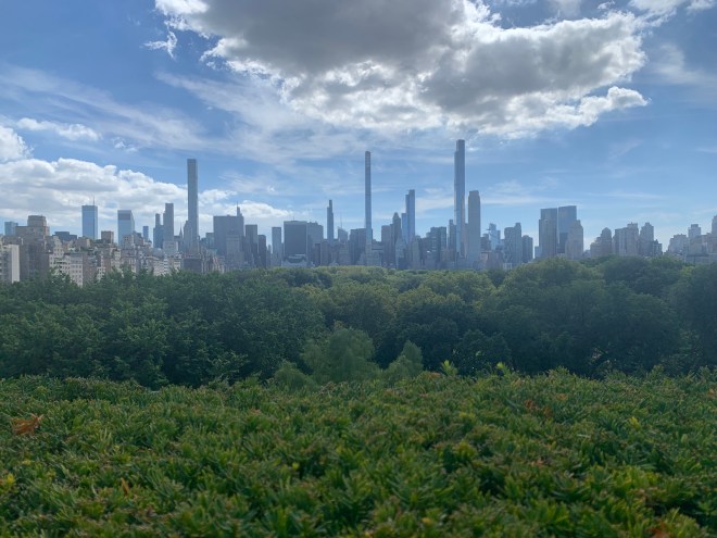 Il n’est pas absolument facile à trouver dans le dédales de salles et de couloirs du Metropolitan Museum. Mais lorsque l’on sort de l’ascenseur, on se trouve un peu ailleurs. Après avoir commandé un cocktail et quelques cacahuètes (le choix des boissons n’est pas très vaste), l’on se précipite vers la vue. D’abord une large étendue de vert, Central Park, qui s’allonge comme un tapis devant l’alignée de gratte-ciel en arrière-fond. Certains, les plus audacieux, ne semblent être que des allumettes en position précaire. un gros nuage vient partiellement obstruer un ciel bleu du mois d’août. La ville semble tellement loin depuis ce petit havre de verdure…