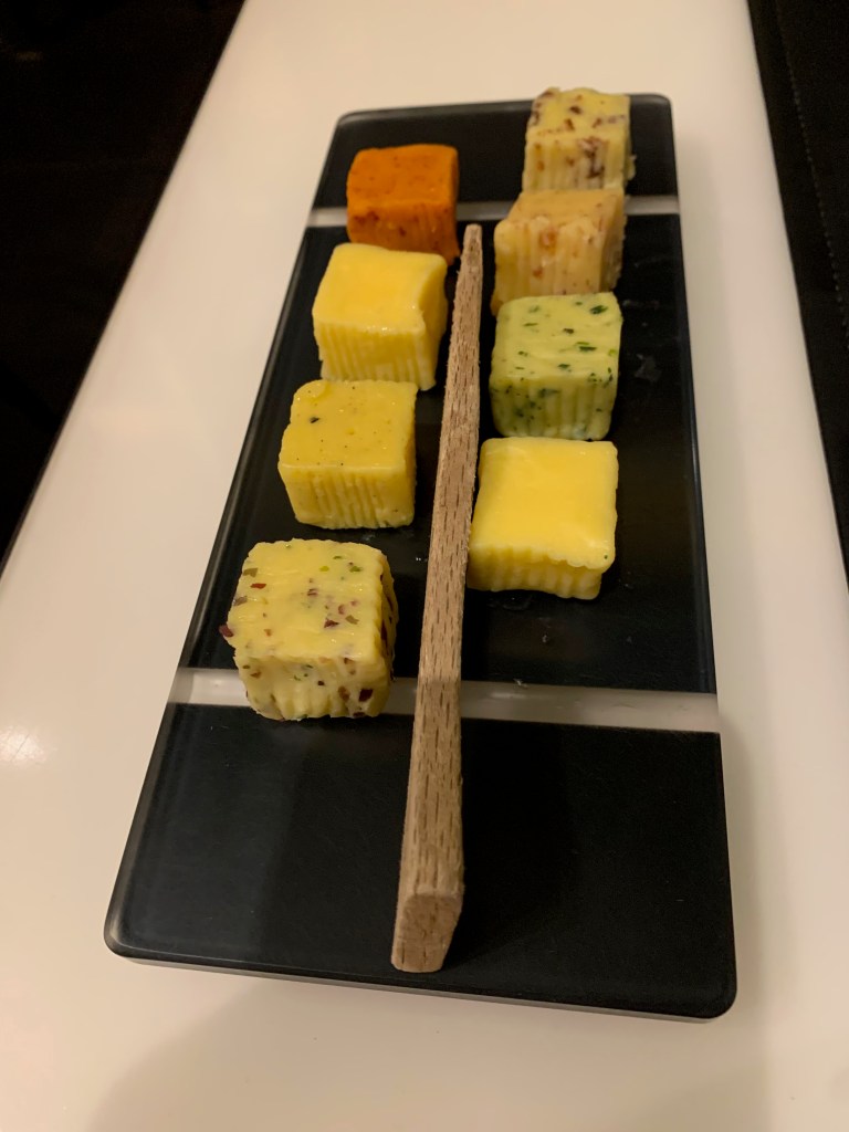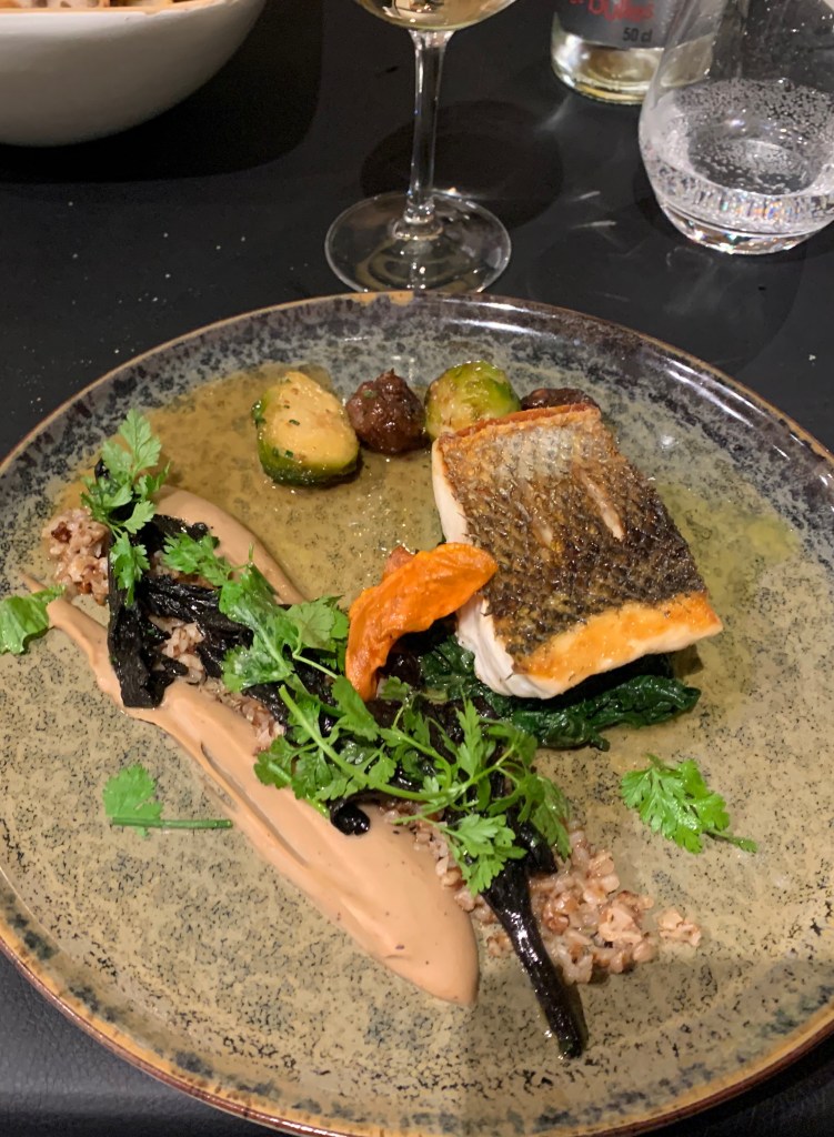 Dans le Bistro donc, la cuisine est aux beurres et les plats raffinés. Le bar à la plancha, châtaignes et trompettes de la mort au beurre sarrasin, graines de Kasha et jus de volaille est un régal… En amuse-bouche, chaque table reçoit une ardoise sur laquelle sont présentés les différents beurres de la maison: yuzu, oignons, piment d’Espelette, sarrasin, vanille… Difficile de résister.