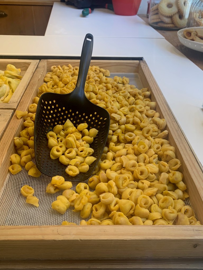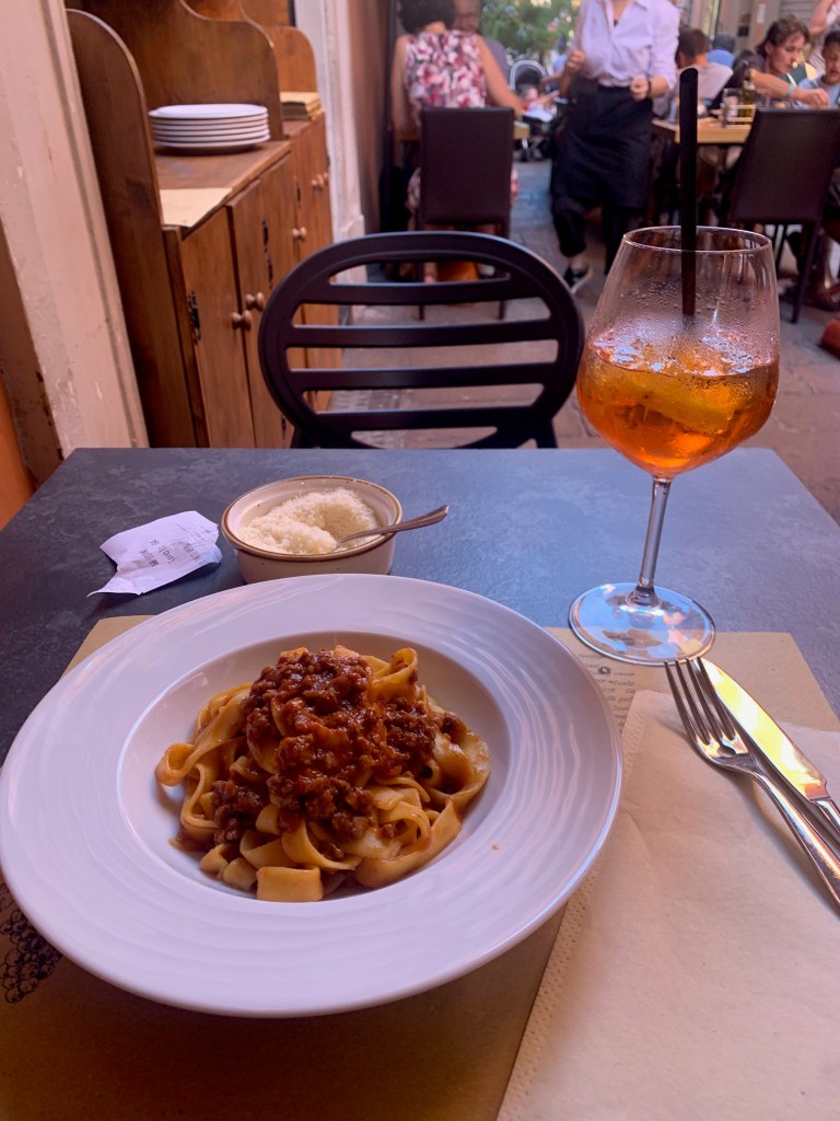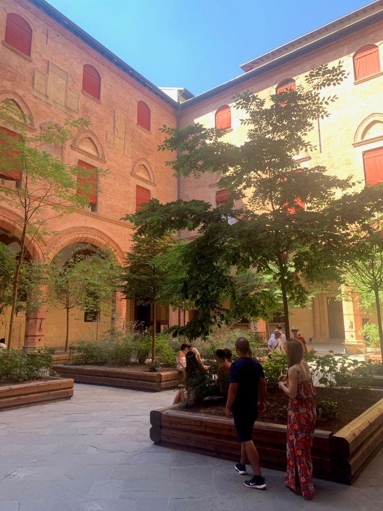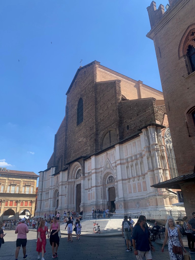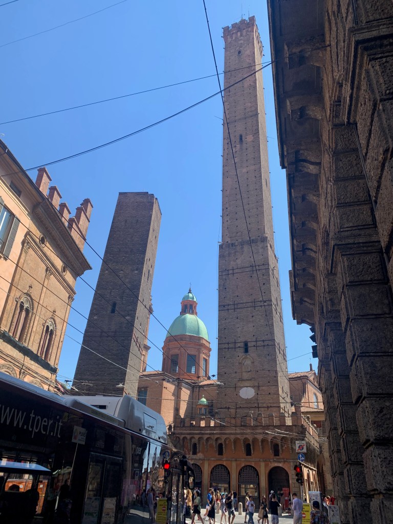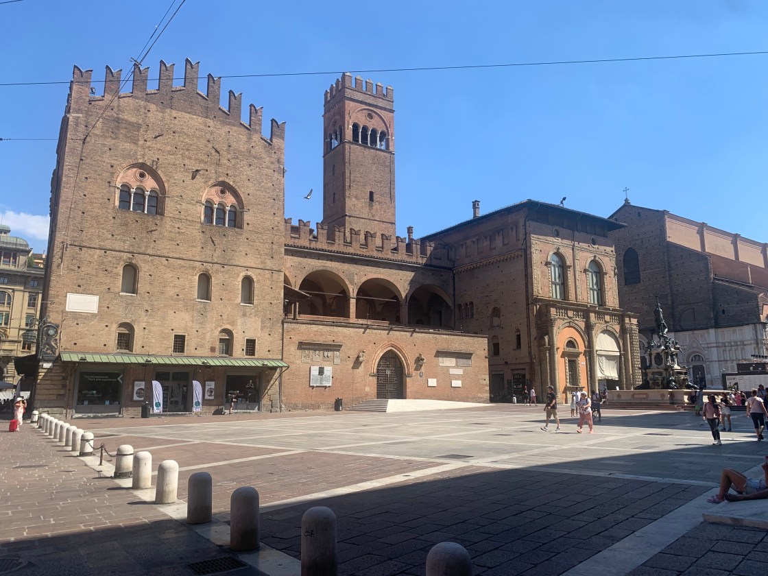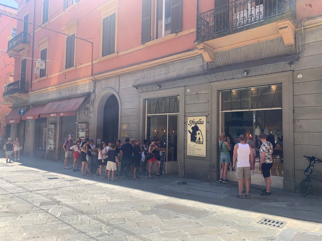 Les arcades des larges rues nous emmènent au centre ville; les rues piétonnes étroites proposent de nombreuses terrasses de restaurant ou de bars à vin. Envie de pâtes? Une adresse ne désemplit pas: chez Sfoglia Rina. Les locaux et les touristes n’hésitent pas a faire la queue sous le soleil et 34 degrés à l’ombre pour déguster les nombreuses sortes de pâtes farcies. Consolation pour celles et ceux qui n’ont pas su ou pu patienter: l’établissement est à la fois une boutique et un restaurant. On peut donc facilement rapporter chez soi un emballage de délicieuses spécialités… Encore une chose, à propos de pâtes. Ici les pâtes « bolognaise », on ne connaît pas, on mange des pasta al ragù. Oui, oui, c’est un peu comme des bolognaises, et c’est très bon.
