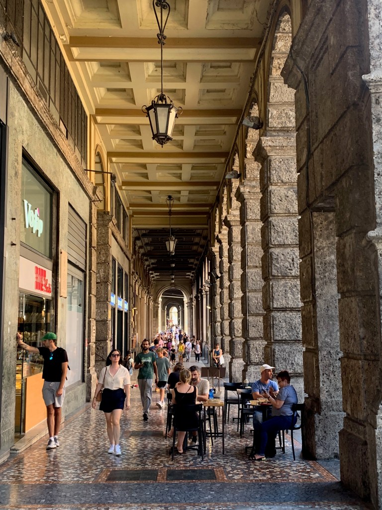 On peut visiter Bologne lorsqu’il pleut ou lorsqu’il fait très chaud. Selon les guides, c’est en effet la ville d’Italie qui compte le plus de kilomètres d’arcades, permettant ainsi au visiteur de s’abriter de la pluie ou du soleil.