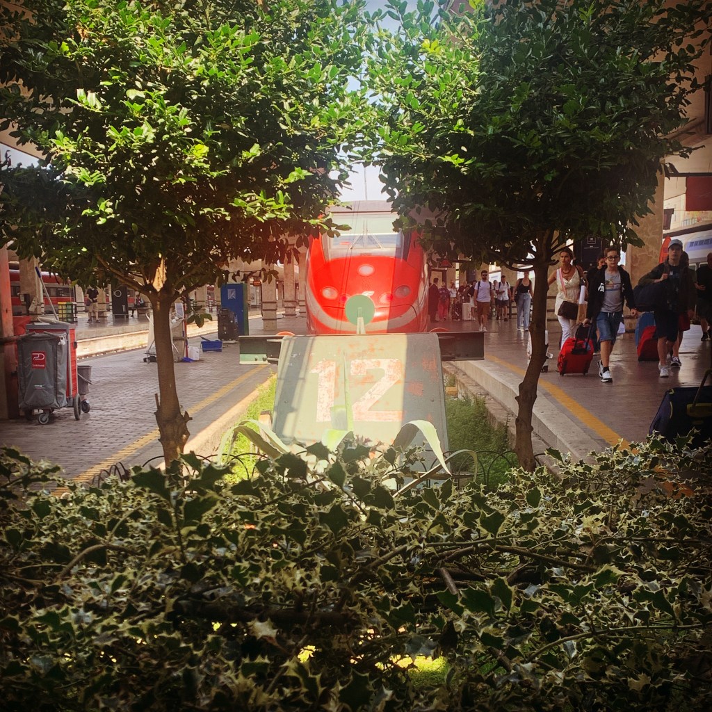 Depuis Milan, il faut compter un tout petit peu moins de deux heures, grâce à la Frecciarossa de Trenitalia, avec quelques pointes à 300 km/h. Le convoi traverse les brumes de la plaine du Pô et passe à proximité d’un lieu plutôt célèbre: Marignan… Oui , celui de 1515. Mais pas le temps de chercher la trace d’une ancienne bataille, nous voici déjà en Emilie Romagne, Bologne, puis de nombreux tunnels, et déjà Florence. On aperçoit depuis le quai la peu discrète coupole du Dôme de Brunelleschi…