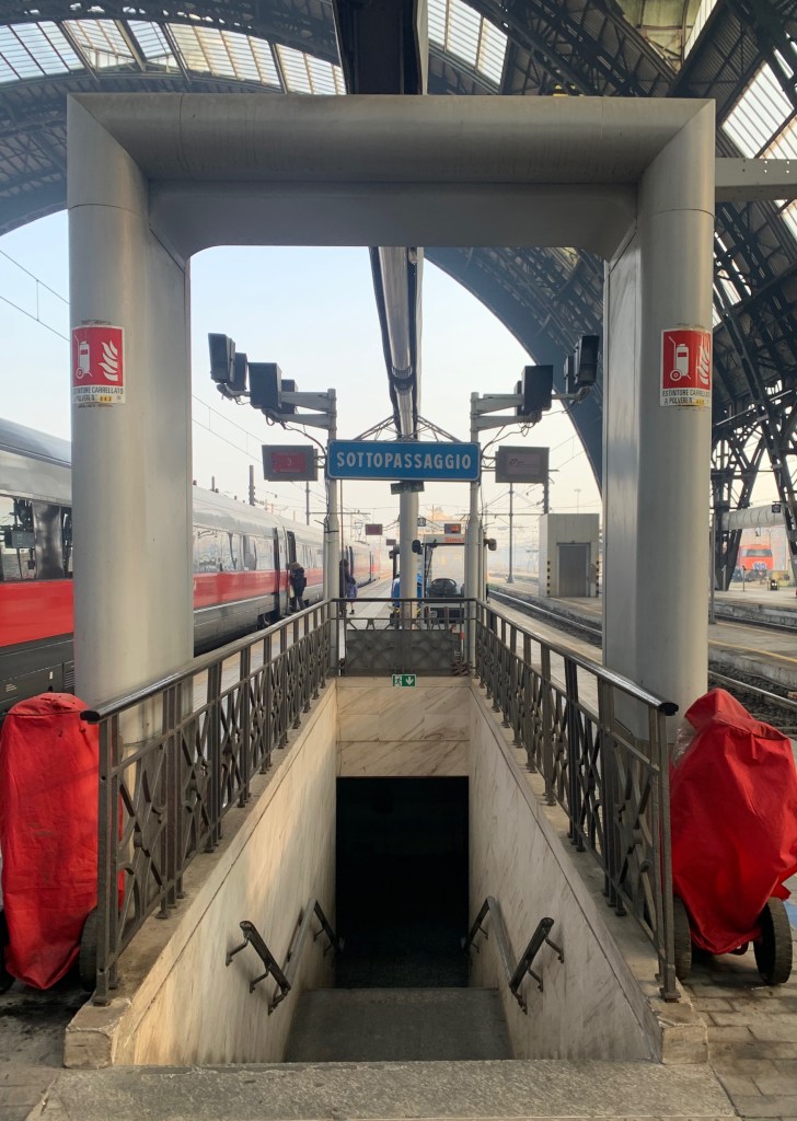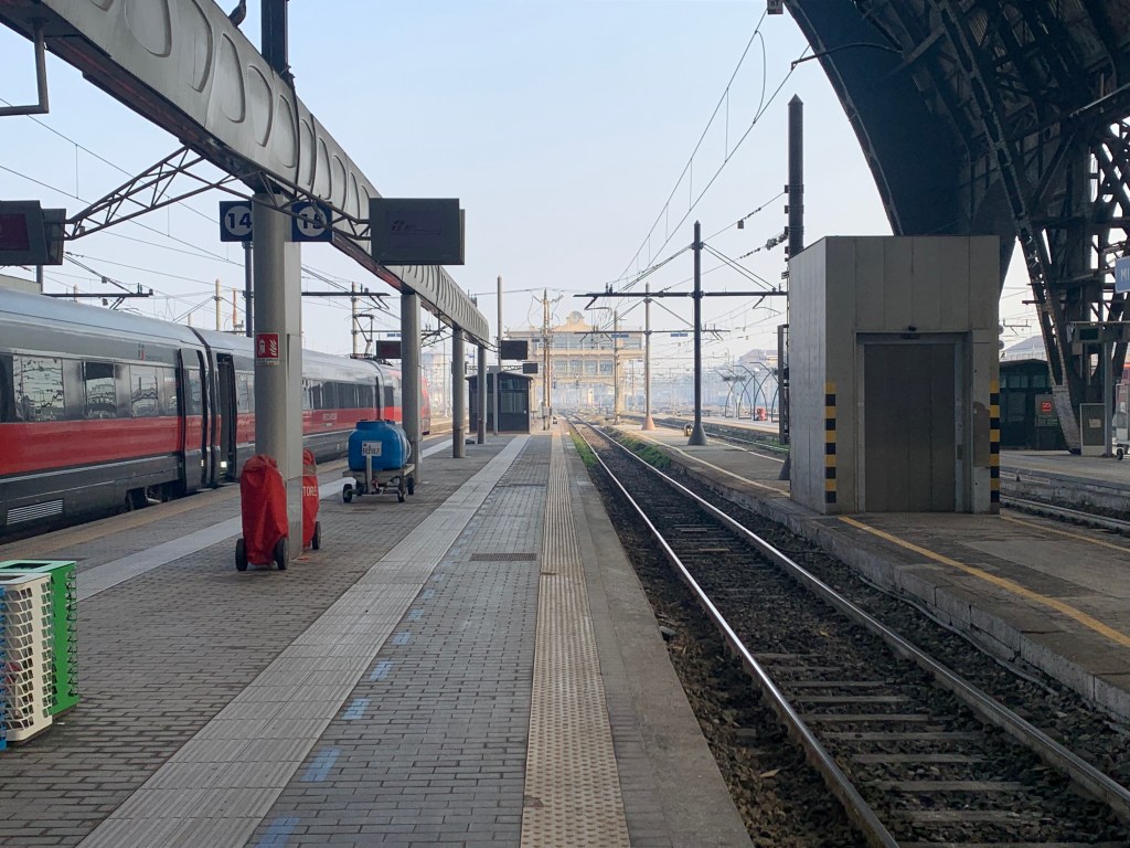 Confortablement assis dans l’ETR 610, l’un des trains qui relient plusieurs fois par jour la Suisse romande à Milan, je délaisse mon roman pour observer la nuit qui s’efface tandis que les premières lueurs roses viennent doucement se poser sur les plus hauts sommets du Valais. A Domodossola, le train prend 6 à 7 minutes de retard, un peu par tradition. Mais rien de grave, le convoi arrive dans la majestueuse gare de Milan avec une dizaine de minutes de retard. Et la correspondance est dans 20 minutes. Tout va bien. Même pas besoin d’emprunter le raccourci…