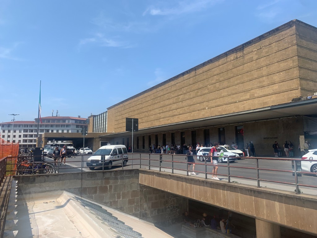 La gare de Florence n’est pas vraiment du même architecte que le Dôme. On dira que c’est du style moche à très moche. Bon, ça tombe bien, ce n’est pas forcément le principal monument de la ville. Le meilleur plan: se débarrasser de ses bagages le plus rapidement possible, par exemple à l’Hôtel Ambasciatori, juste en face de la gare, et se diriger vers le centre. La coupole du Dôme agit comme un aimant et l’on se retrouve très vite au pied de celui-ci. On s’en rend assez vite compte car les rues se sont remplies de touristes, on entend beaucoup parler l’anglais.