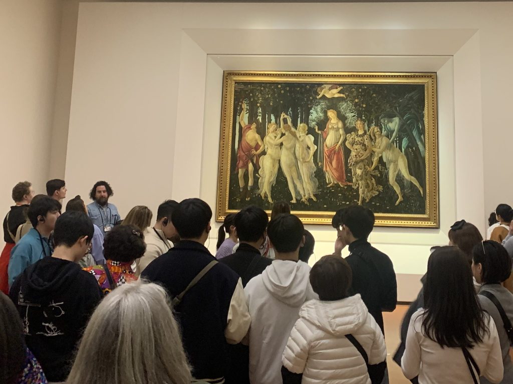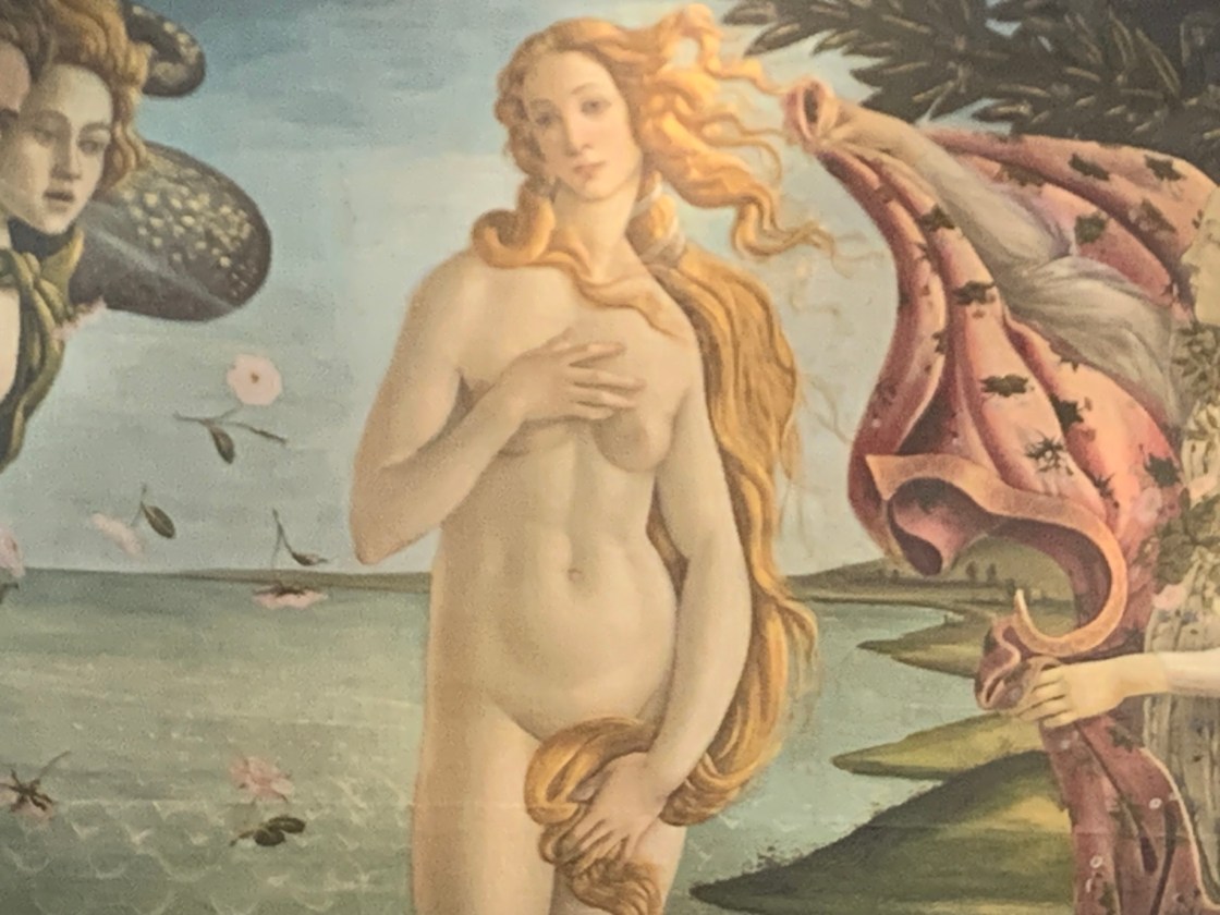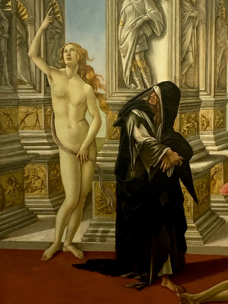Mais nous n’avons pas de temps à perdre, nous avons rendez-vous avec Simonetta Vespucci. Elle nous attend à la Galerie des Offices, à quelques centaines de mètres de là. Il est préférable de prendre rendez-vous, donc de réserver son billet d’entrée à l’avance sur Internet; la même recommandation est valable pour les autres musées.  Une fois à l’intérieur du musée, il faut prendre le temps de parcourir quelques salles et se rendre compte asez rapidement que Simonetta ne va pas nous accorder un rendez-vous particulier. Nous voici donc dans la grande salle qui réunit plusieurs tableaux de Sandro Botticelli. On commence par le Printemps. Simonetta n’est pas au centre du tableau, mais elle est l’une des trois Grâces, quatrième depuis la gauche.