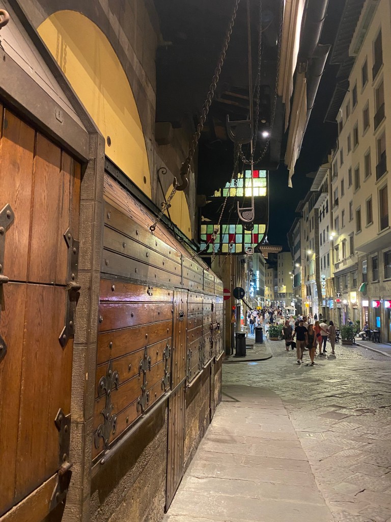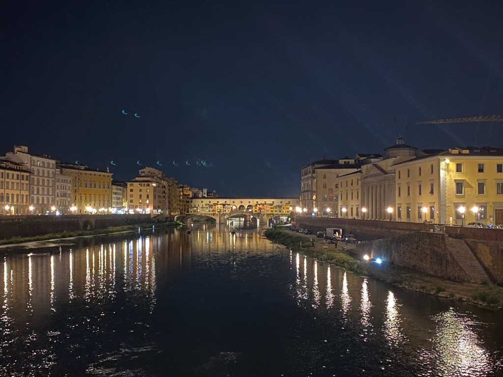 Le long de l’Arno. Le soir, le Ponte Vecchio, une fois les boutiques closes, prend une allure moins mercantile.
