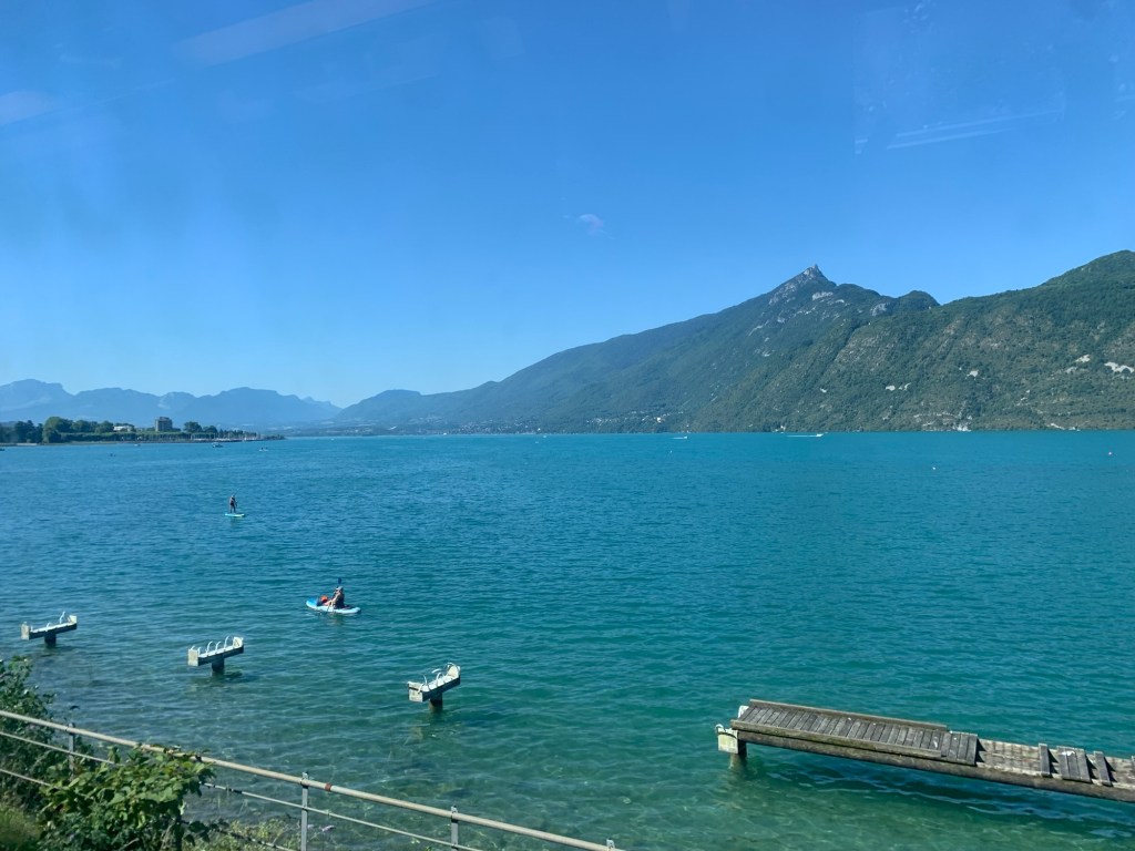 La surprise se dessine lorsqu’après un arrêt de quelques minutes peu avant la gare de Culoz, mon convoi longe le lac du Bourget. Magnifique paysage, mais je crois que ce n’est pas le trajet habituel… L’appli SNCF donne la réponse : « En raison d’une absence d’alimentation électrique autour d’Ambérieu, le TGV aura un retard à l’arrivée d’environ une heure trente.» À Chambéry, en effet, le train change de sens pour rejoindre Lyon en passant par une ligne secondaire et La Tour-du-Pin. C’est très joli, je ne l’avais encore jamais prise, et, bon, pour surmonter la « malédiction du Genève-Lyon », je suis confortablement et sereinement assis dans un TGV Lyria que je ne quitterai pas avant Marseille…