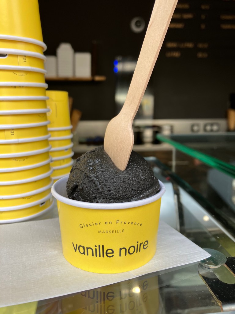 On trouvera facilement de sympathiques petits bistrots dans le Panier, il suffit de se promener. Voici tout de même deux adresses proches l’une de l’autre: « Vanille noire », qui propose d’excellentes glaces, dont l’une, étonnante, parfaitement noire et au goût vanille. Ils ne donnent pas leur recete, mais on peut imaginer que du charbon est à l’origine de cette couleur noir intense…